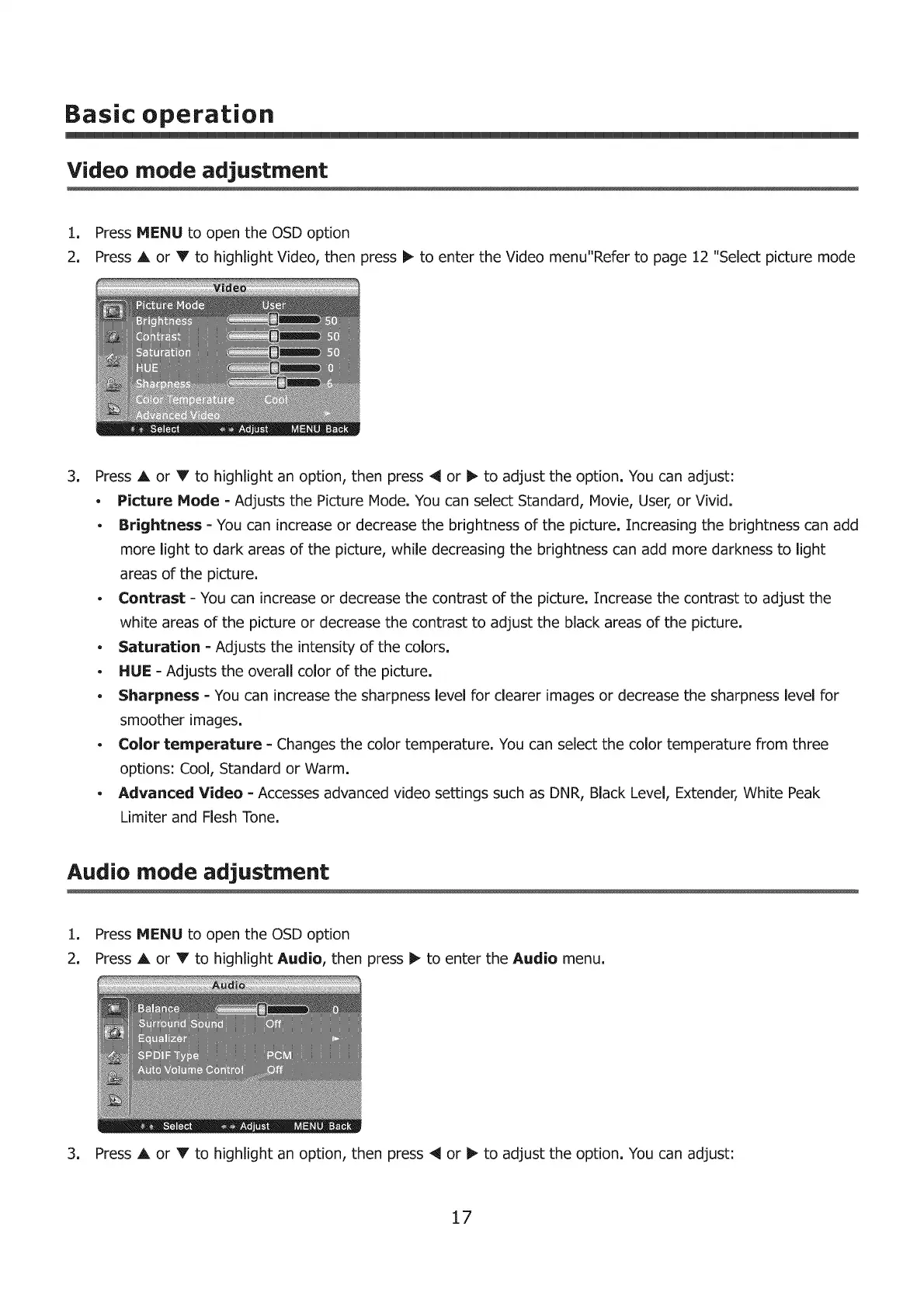 . Advanced Video = Accesses advanced video settings such as DNR, Black Level, Extender, White Peak
