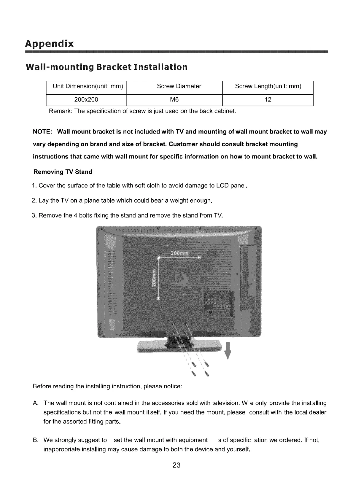 NOTE: Wall mount bracket is not included with TV and mounting of wall mount bracket to wall may