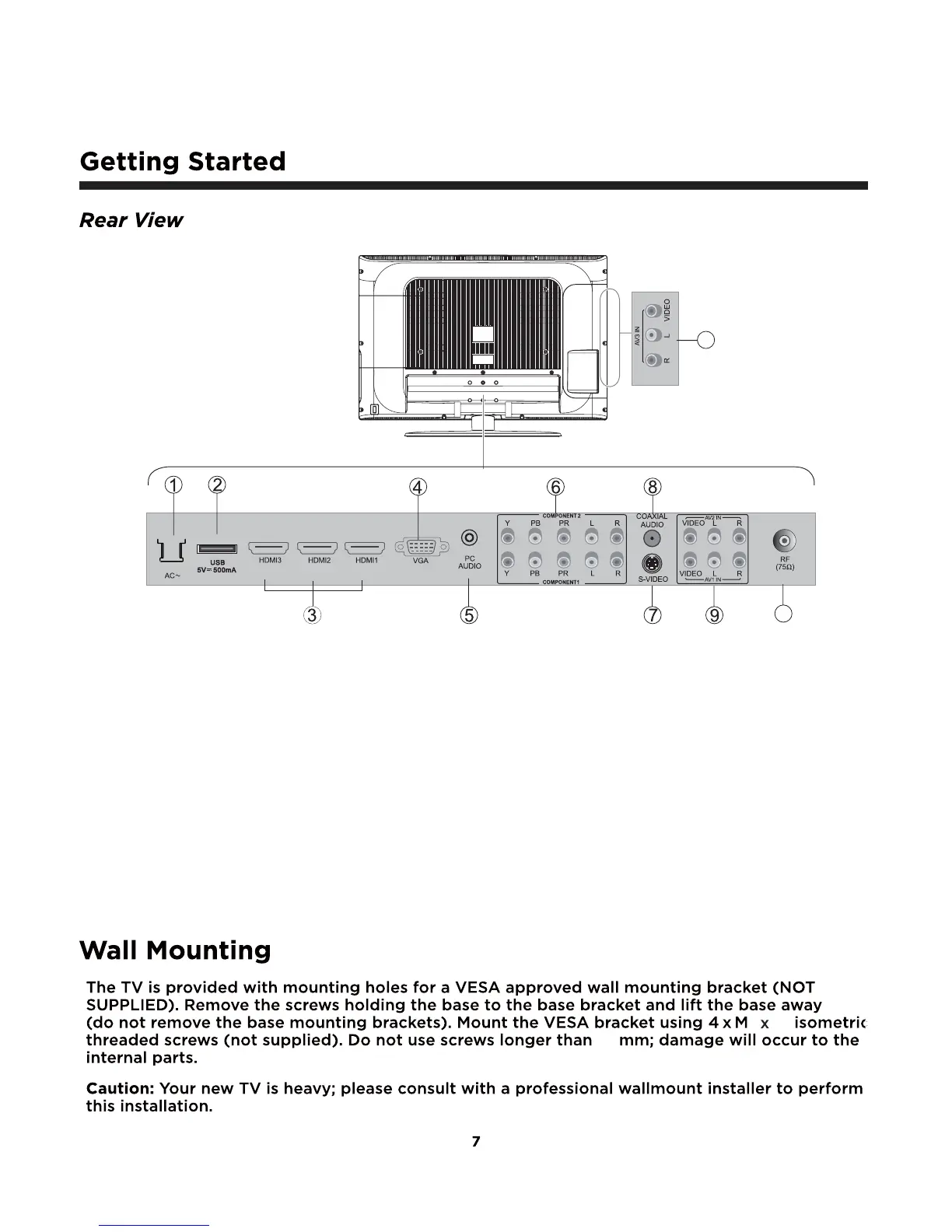 Element ELDFW322 - Rear Panel Connections; Wall Mounting Instructions