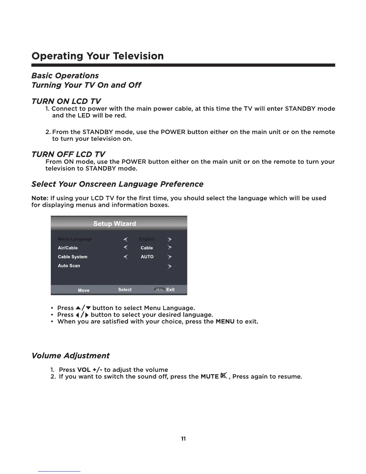 Element ELDFW407 - Operating Your Television; Powering the TV On and Off; Setting Onscreen Language; Adjusting Volume