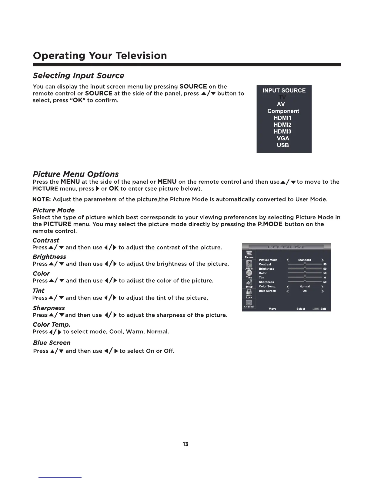 Element ELDFW407 - Selecting Input Source; Picture Menu Settings