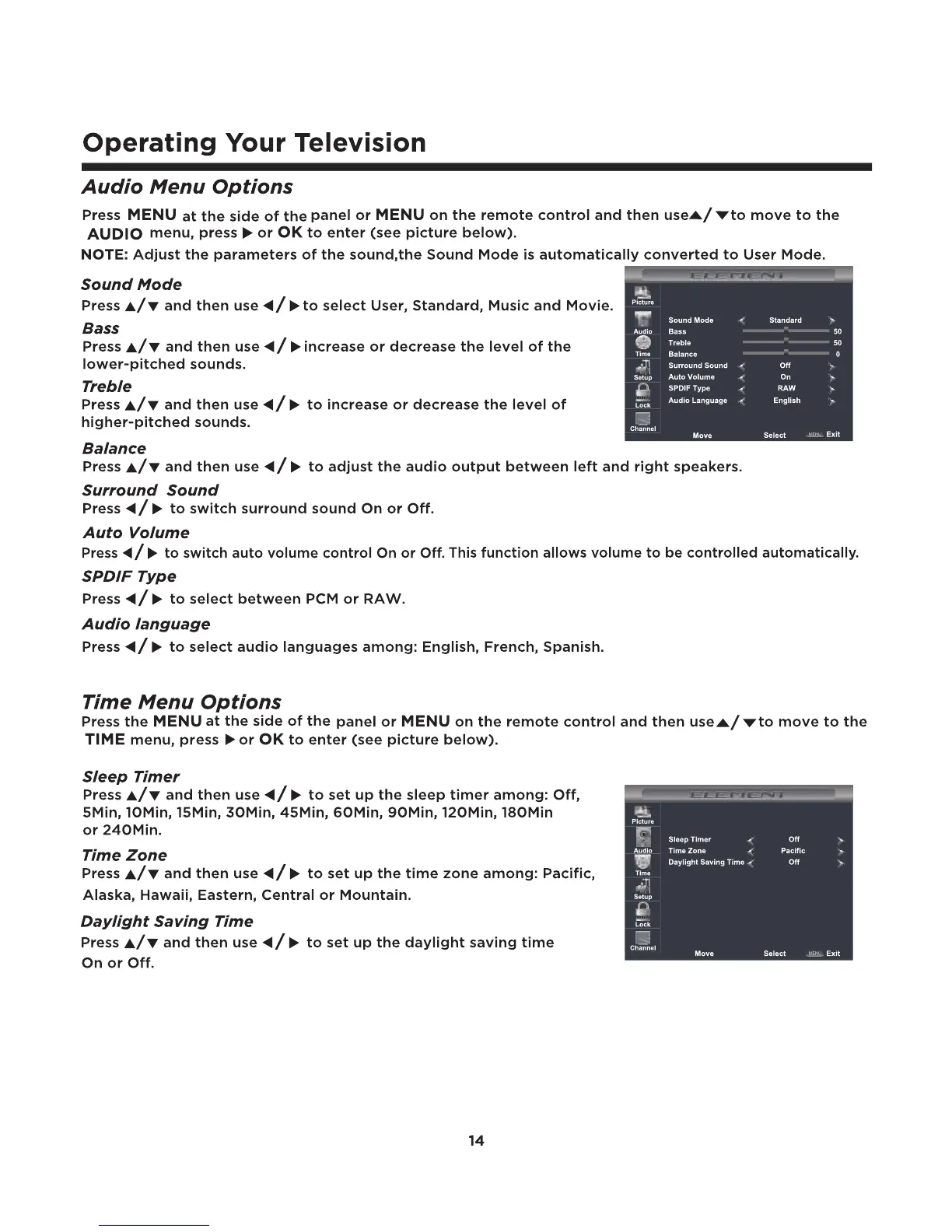 Element ELDFW407 - Audio Menu Settings; Time Menu Settings
