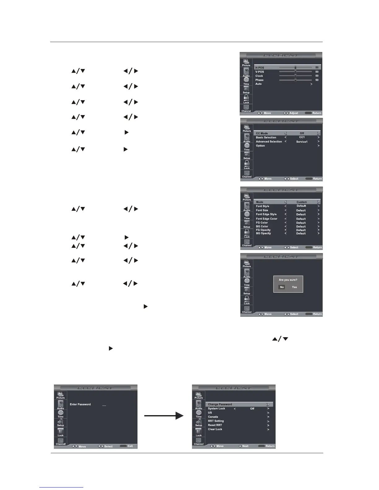 Press the MENU at the side of the panel or on the remote control and then use to move the