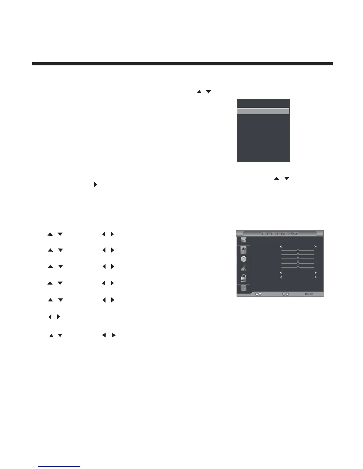 Press the MENU at the side of the panel or MENU on the remote control and then use to move the