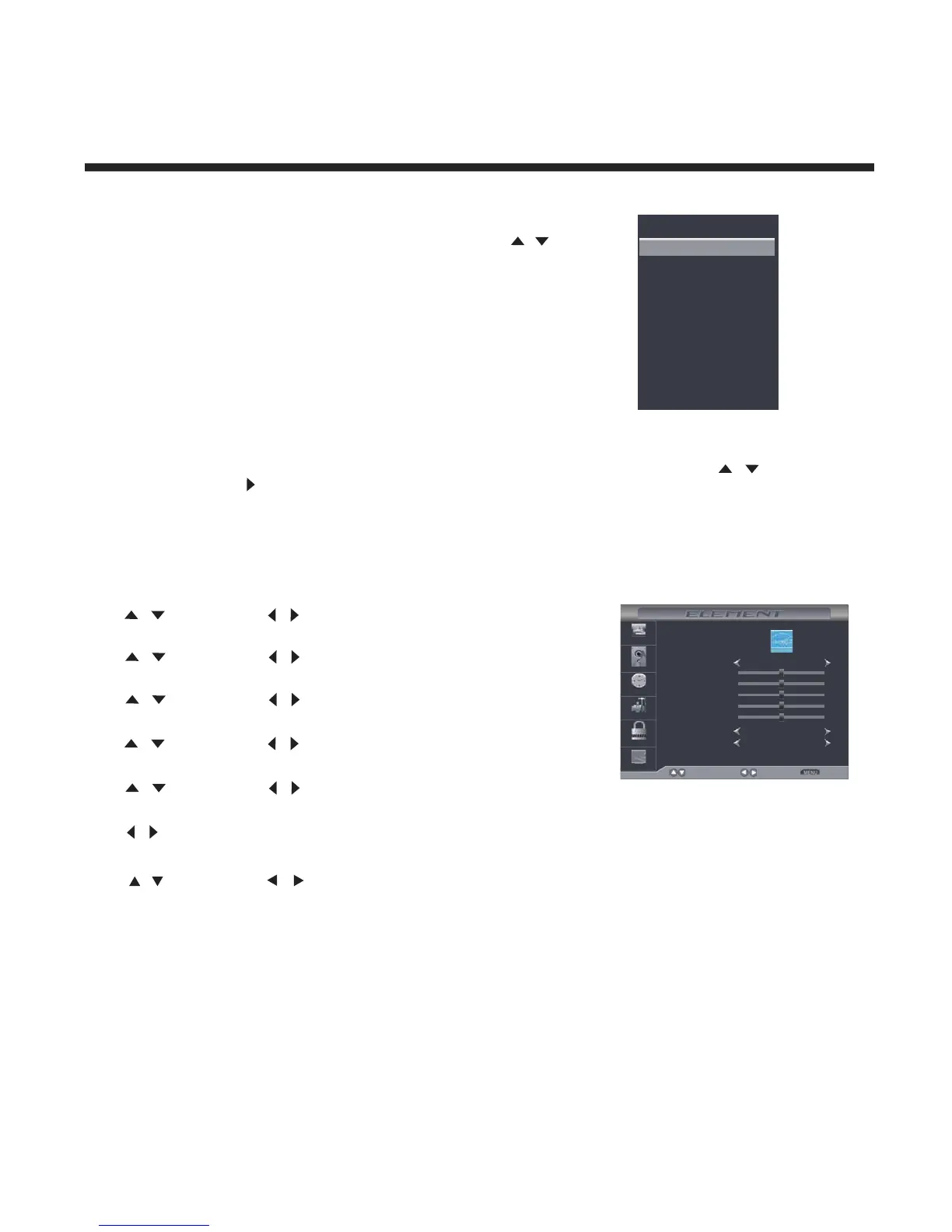 Press the MENU at the side of the panel or MENU on the remote control and then use to move the