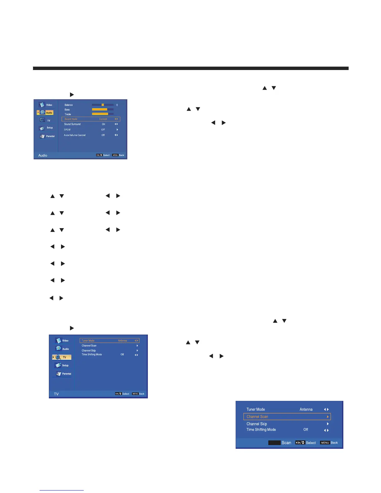 Press the MENU on the front panel or MENU on the remote control and then use / to select the TV