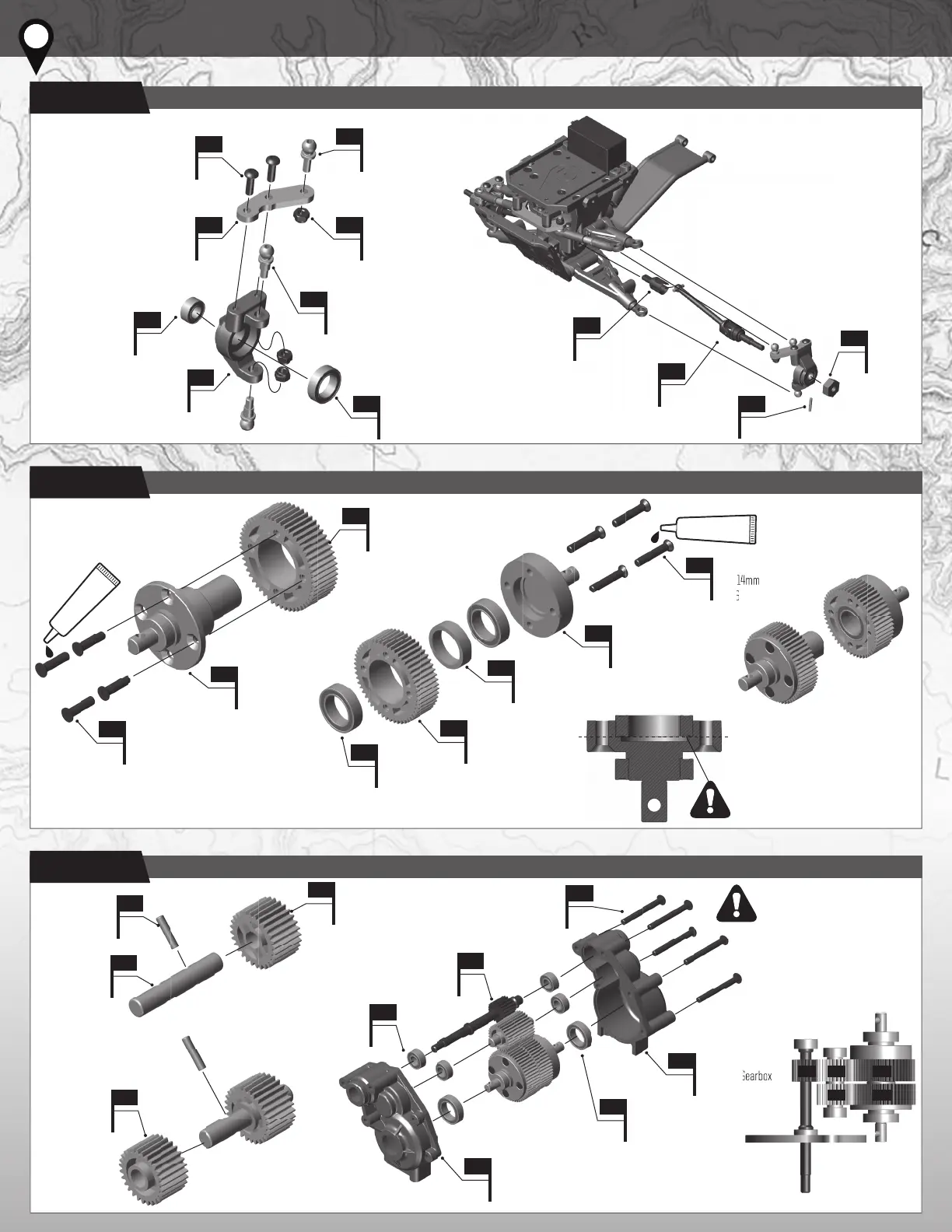 Element Enduro TrailRunner - Front Suspension and Gearbox Details; Gate 04: Steering Blocks; Gate 01: Gearbox Drive Gears; Gate 02: Gearbox Idler and Top Shaft
