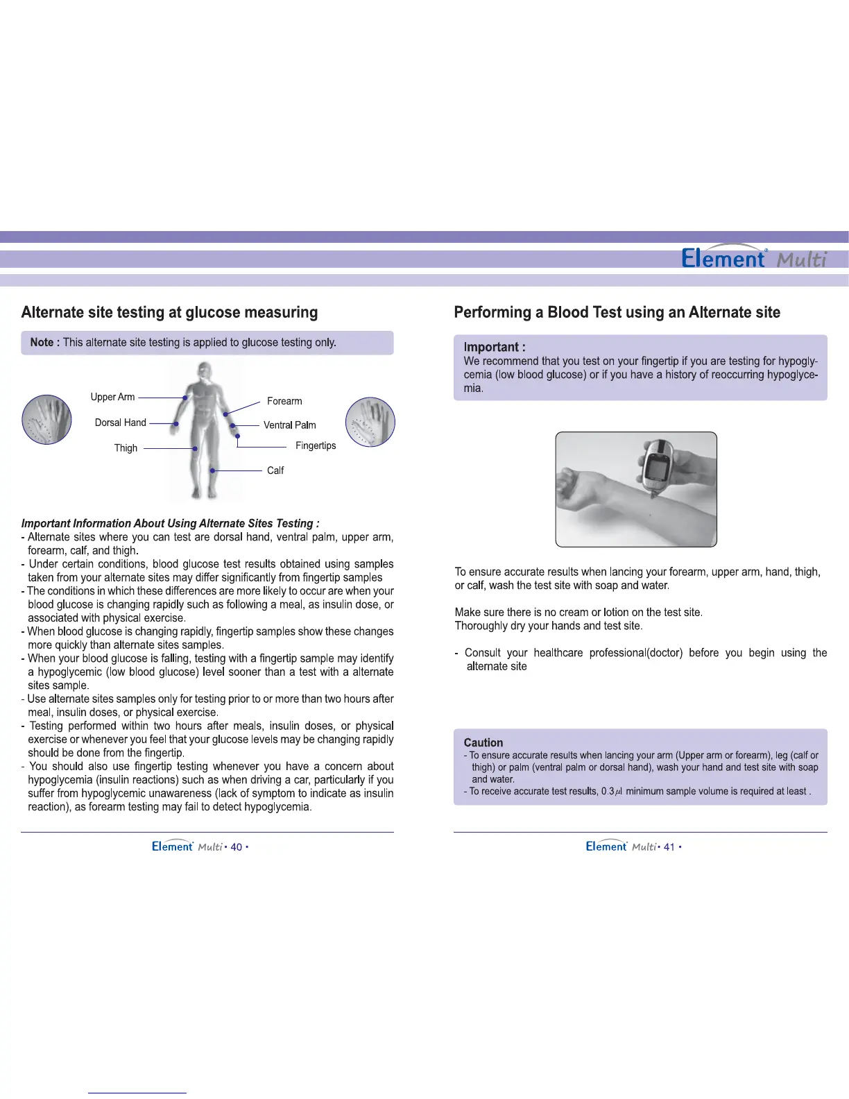 Element Multi - Alternate Site Testing Guide; Key Information for Alternate Site Testing; Alternate Site Blood Test Procedure; Cautions for Alternate Site Testing