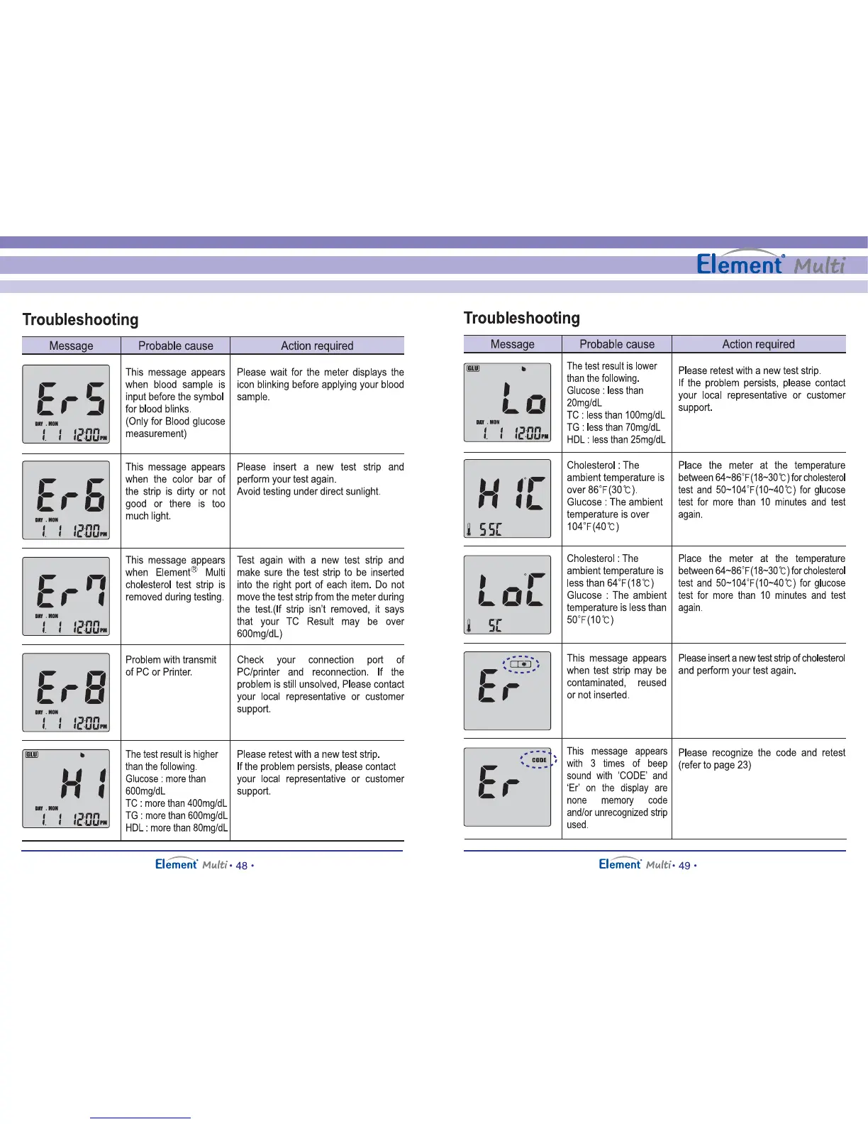Element Multi - Troubleshooting Guide; Troubleshooting Error Messages Er5-Er8; Troubleshooting Low;High Results and Strip Issues