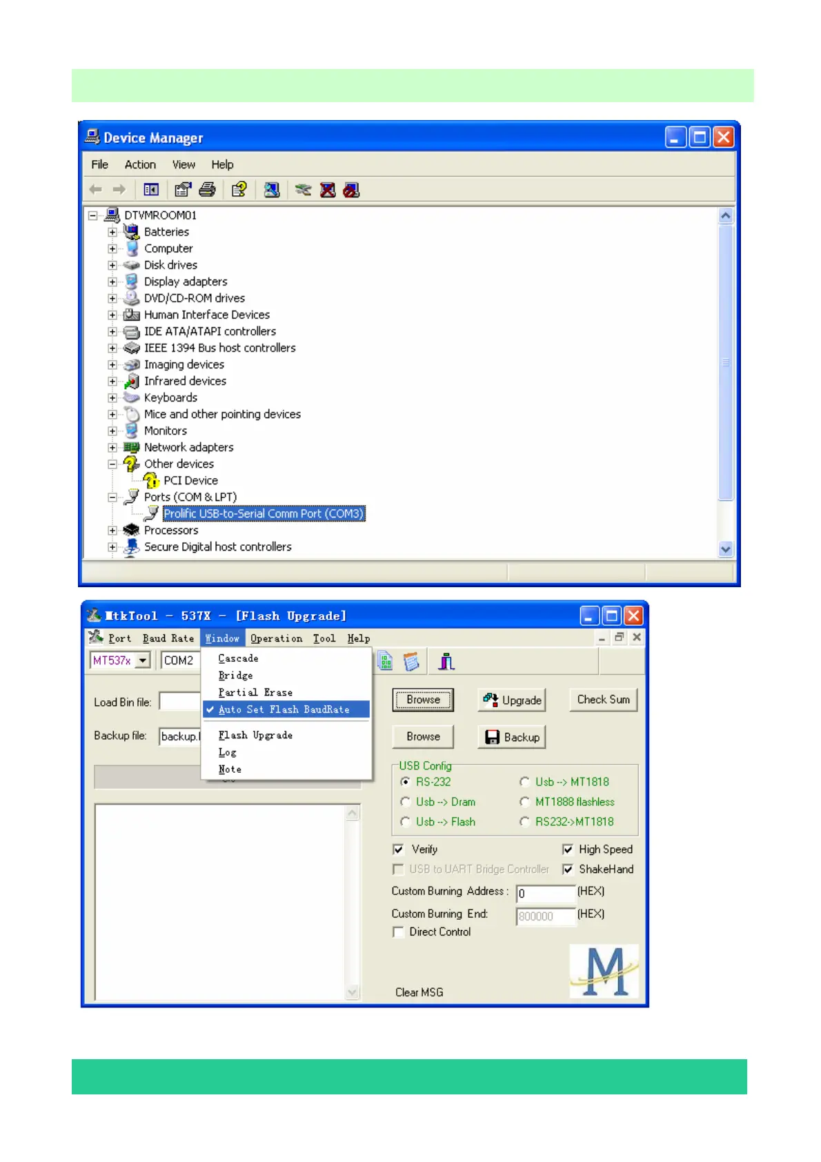 Note: Where or not click the “Auto Set Flash Baud Rate” in the “window” menu depends on the