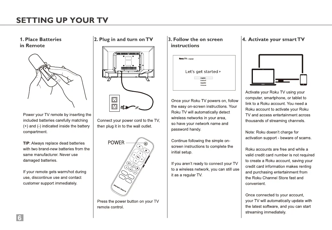 Element Roku TV E1AA24R - Setting Up Your TV; Remote Battery Installation; Powering On and Connecting; On-Screen Setup Guidance