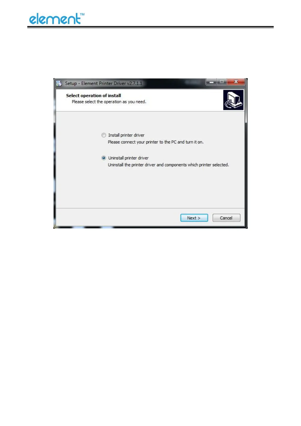 2) Choose Uninstall printer driver, click “Next.