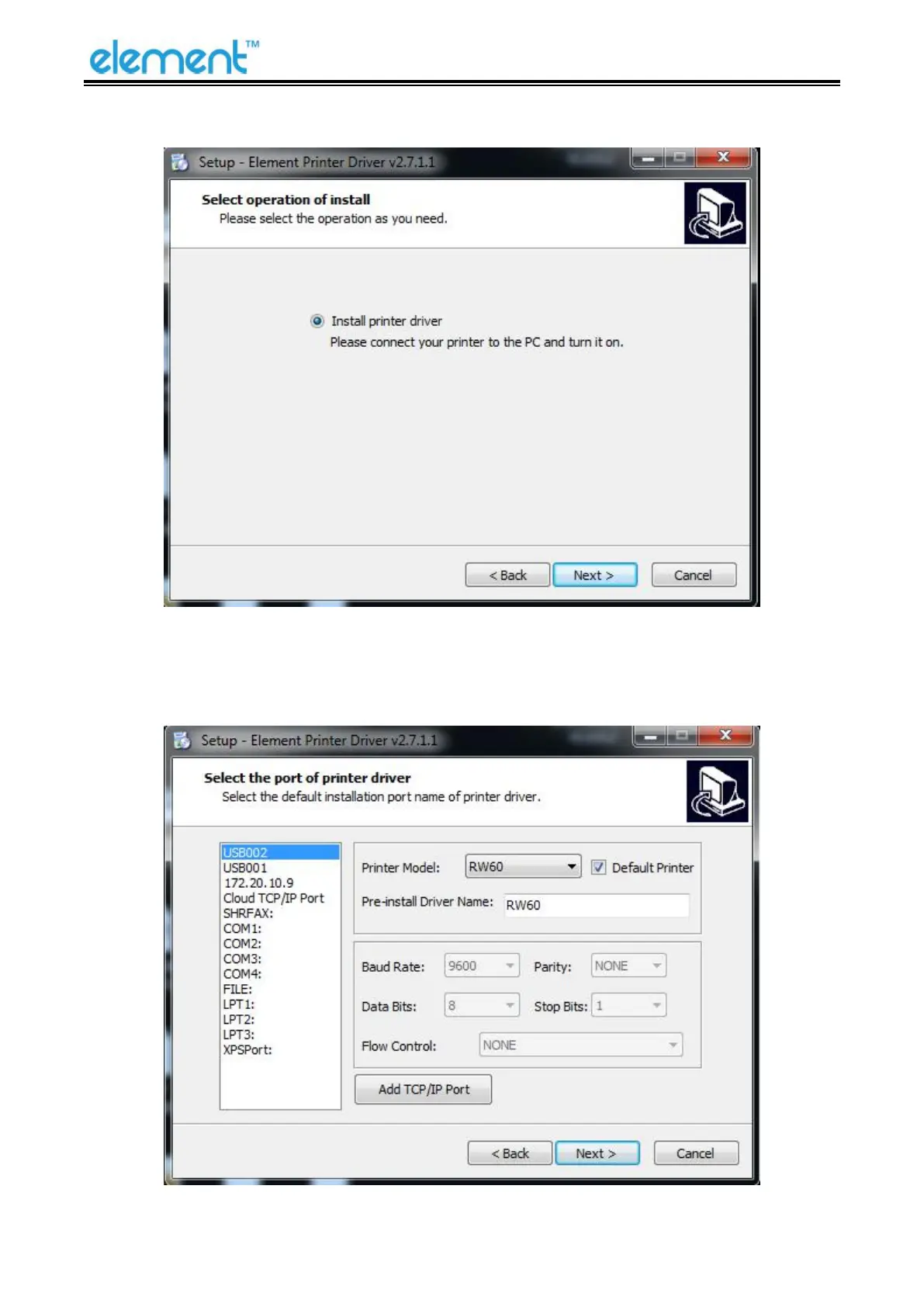 parallel port). Choose the type of driver, port, such as RW60”, “USB” as port. Click “Next”.