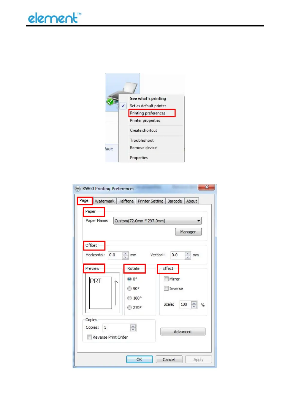 Element RW60 - Detailed Windows Driver Setting; Printing Preferences