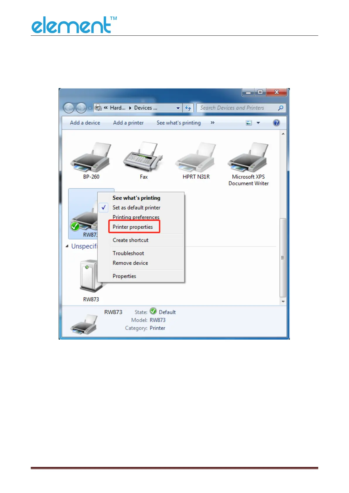 1) Click “Start” → “Devices and Printers”. Right click “RW873” and choose “Printer