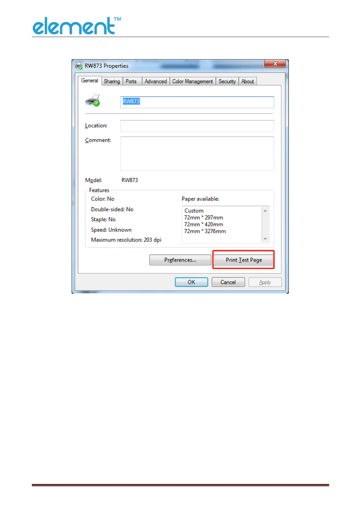2) Choose “General”, click “Print Test Page”, then it will print the current settings.