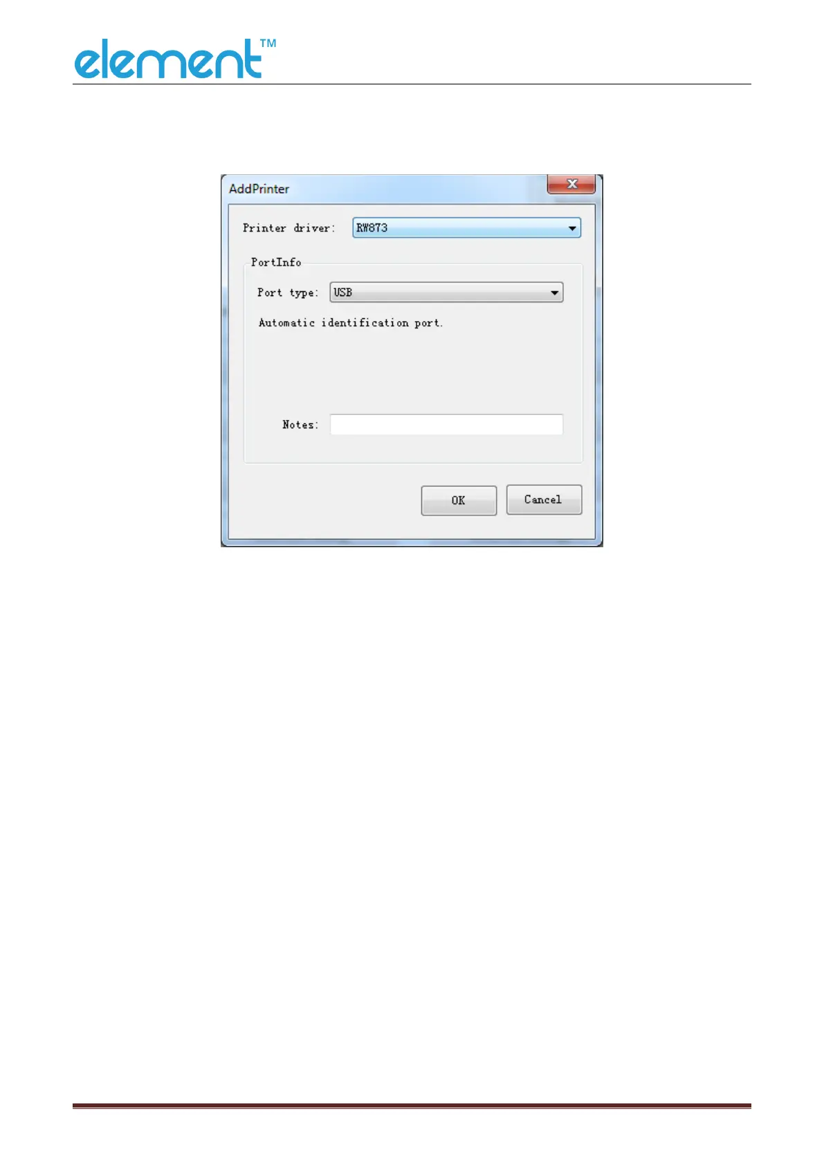 2) Choose the appropriate printer type and port. Then click “OK”. (Take RW873 for