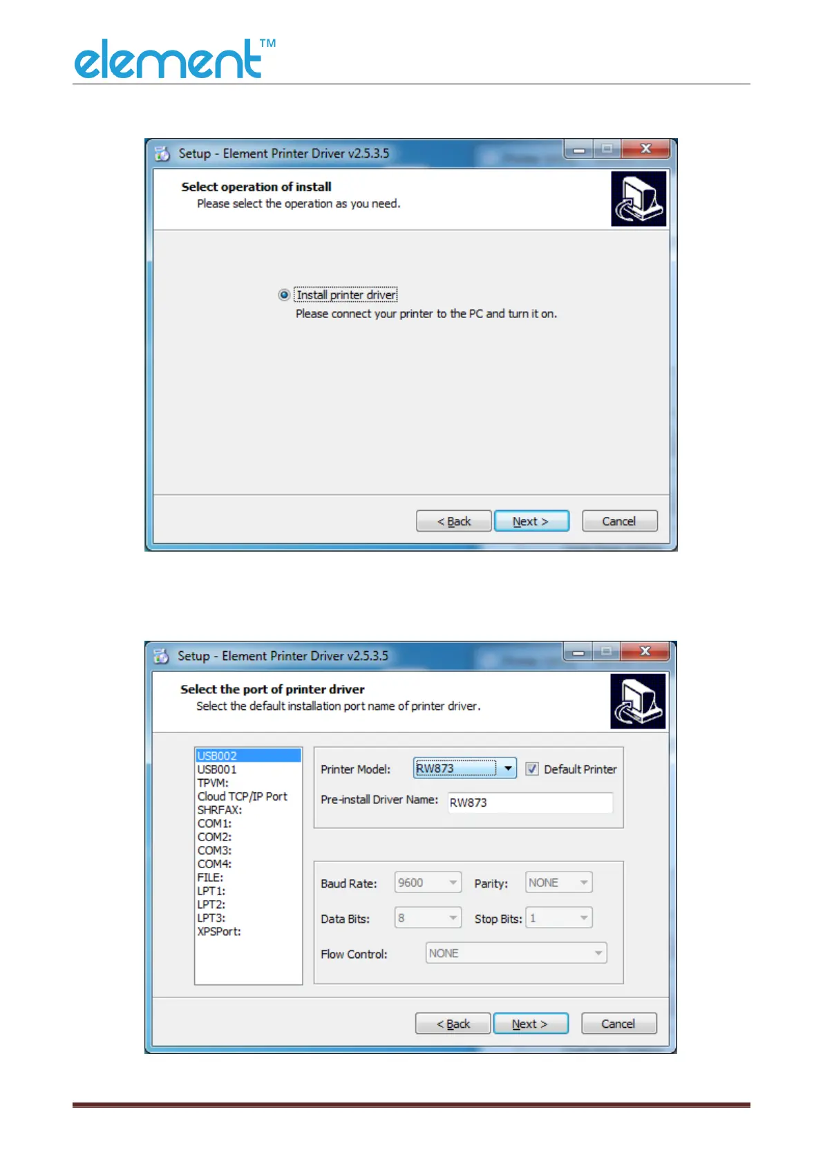 parallel port). Choose the type of driver, port, such as “RW873”, “USB” as port. Click “Next”.