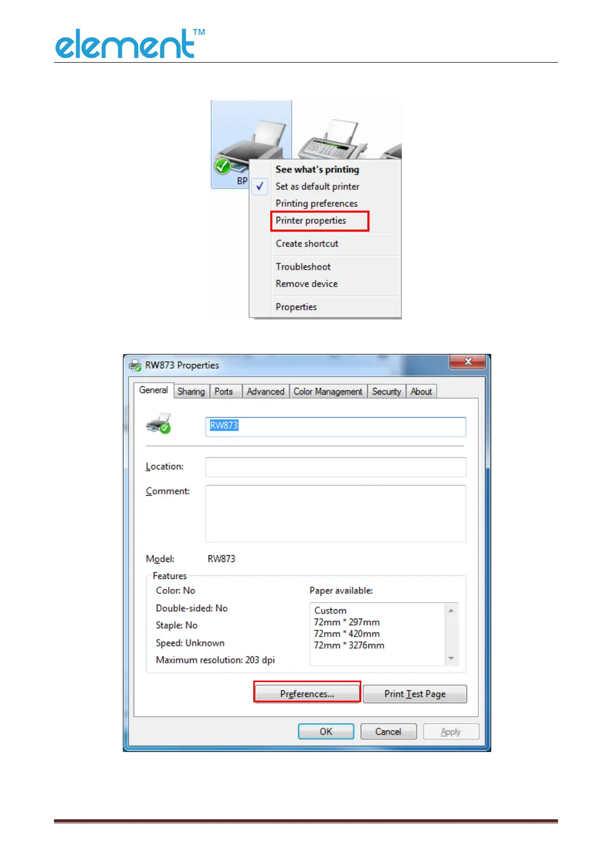 ⑥ Select “Printer properties” in Devices and Printers, then click “Preference”.