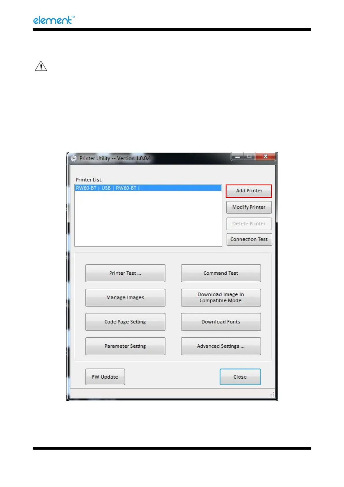 Element RW973 Mk2 - Using Utility Tool; Add;Modify;Delete;Connect Printer