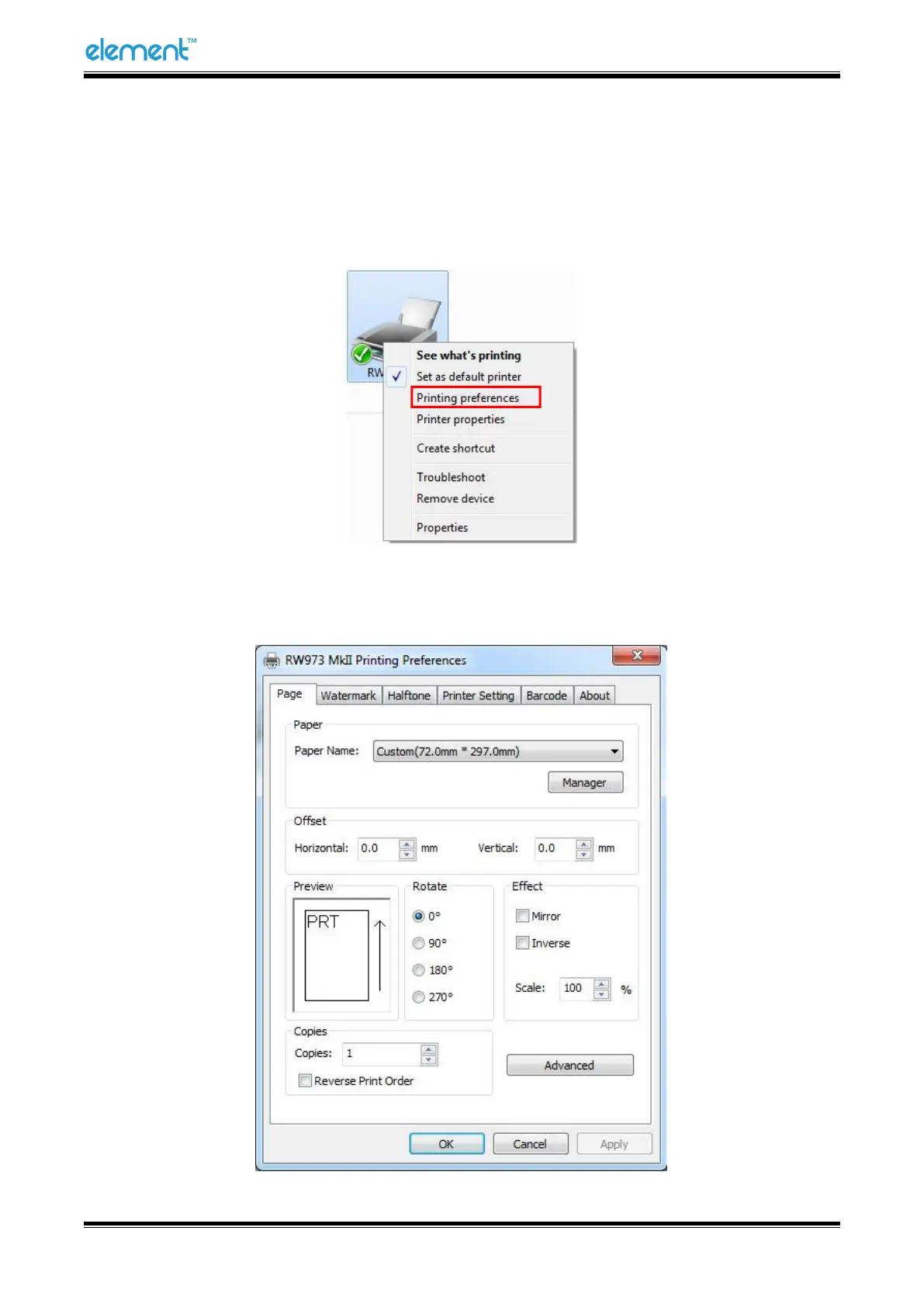 Element RW973 Mk2 - Detailed Windows Driver Setting; Printing Preferences