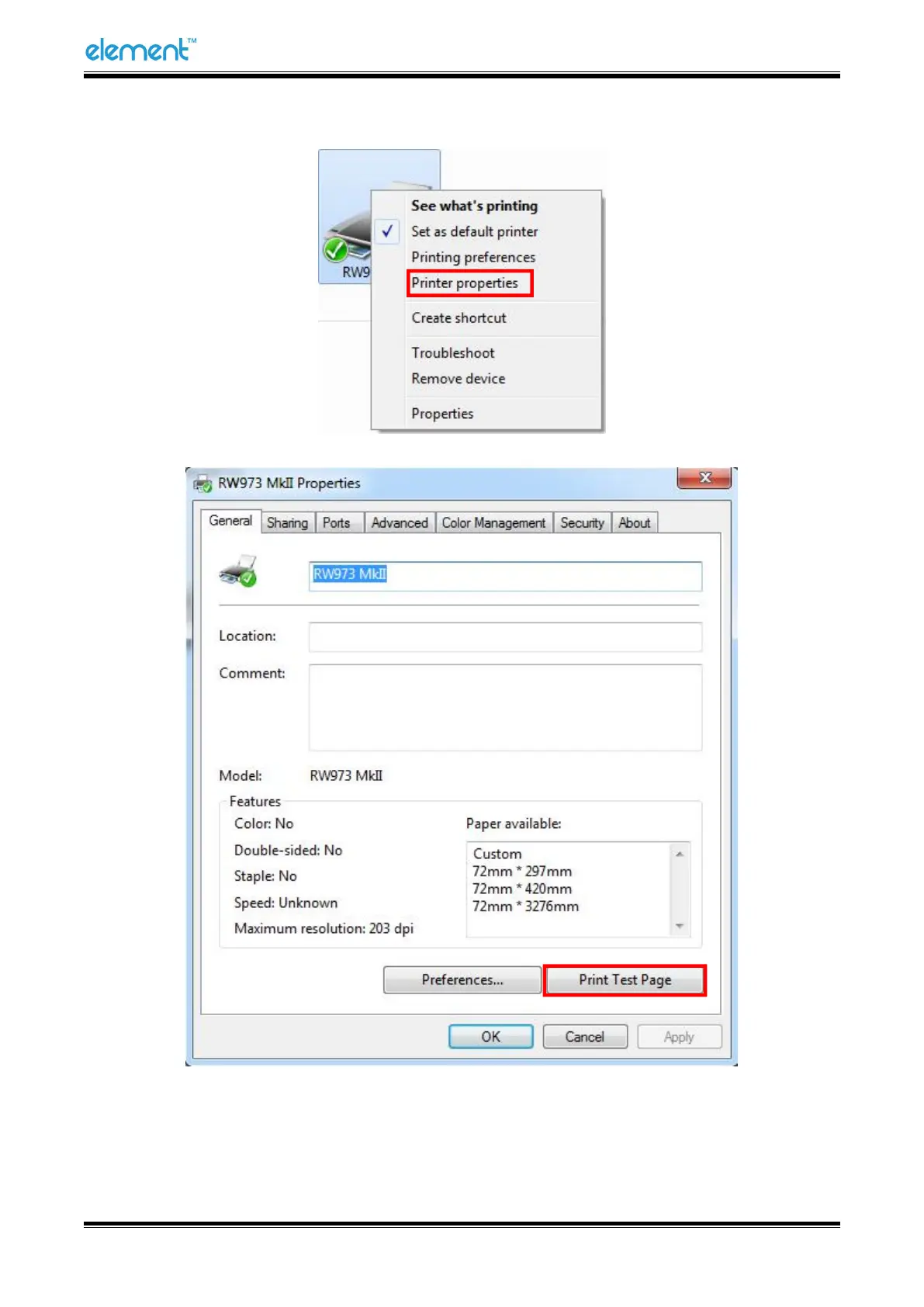 Select Printer properties, click “Print Test Page” to view the printing effect.