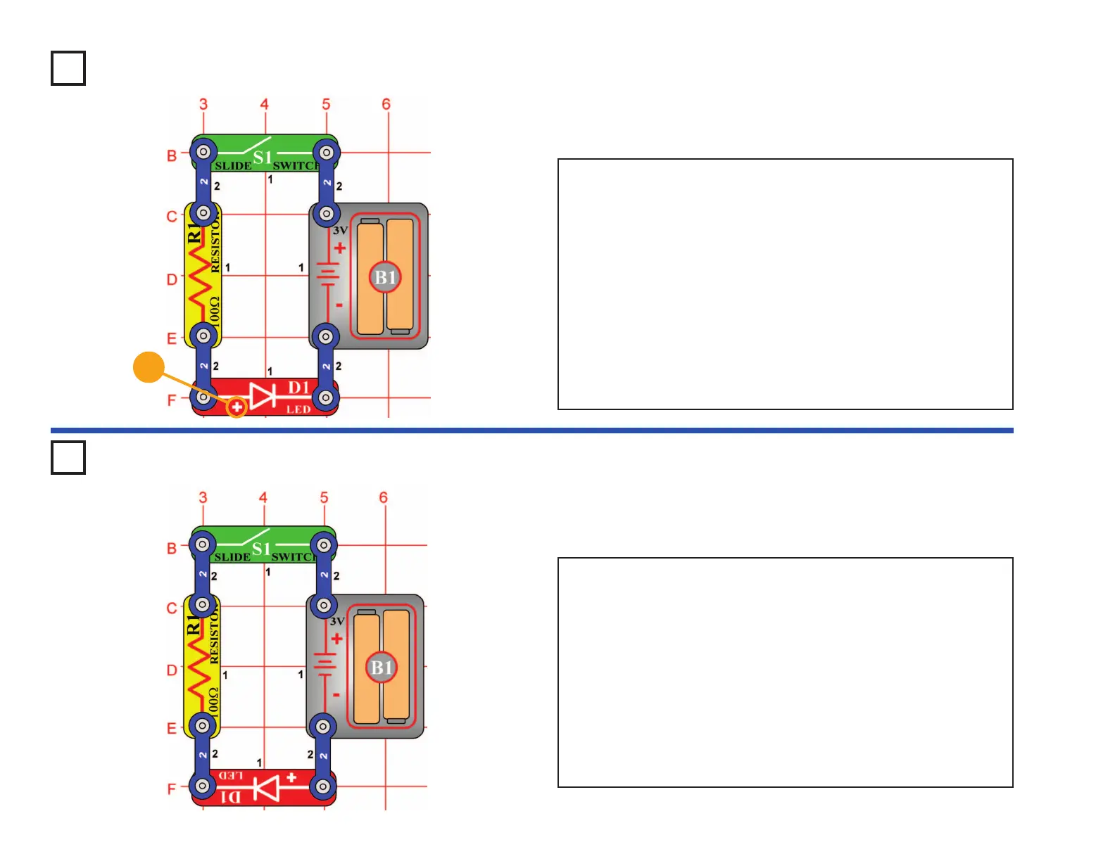 Build the circuit shown on the left by placing all the parts with a black 1 next