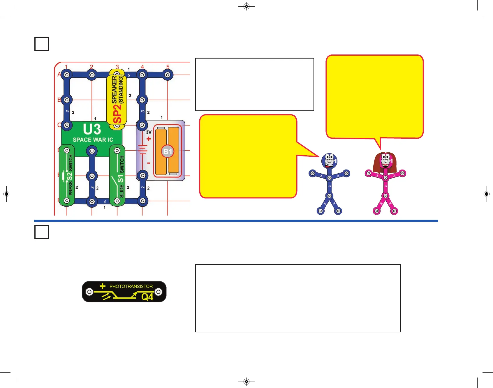 phototransistor (Q4), with “+” toward U3. The circuit immediately makes noise