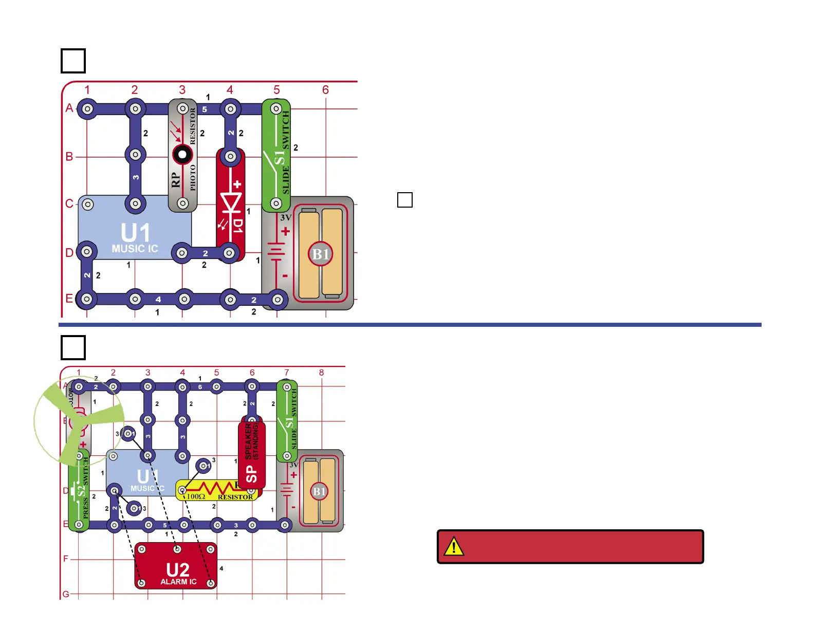 IC (U2) directly over the music IC (U1), resting on three 1-snaps. Turn