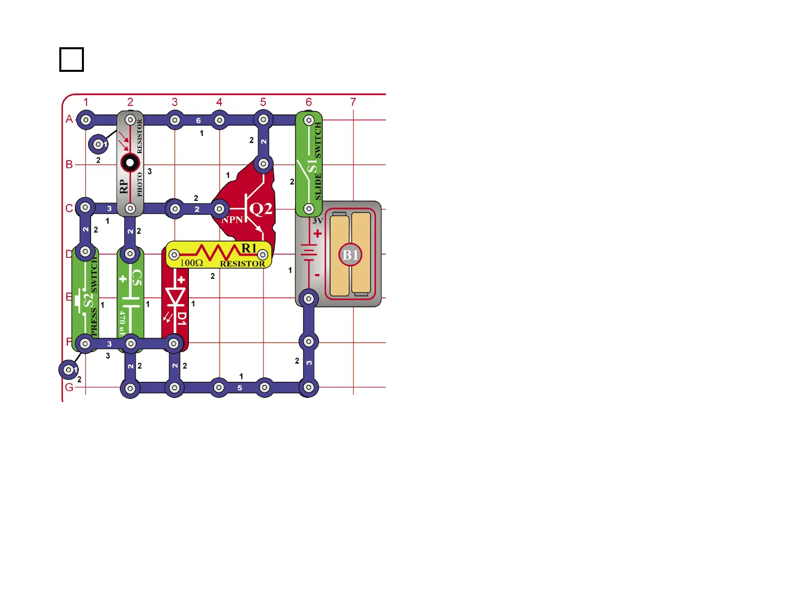 Cover the photoresistor (RP) and turn on the slide switch (S1). The