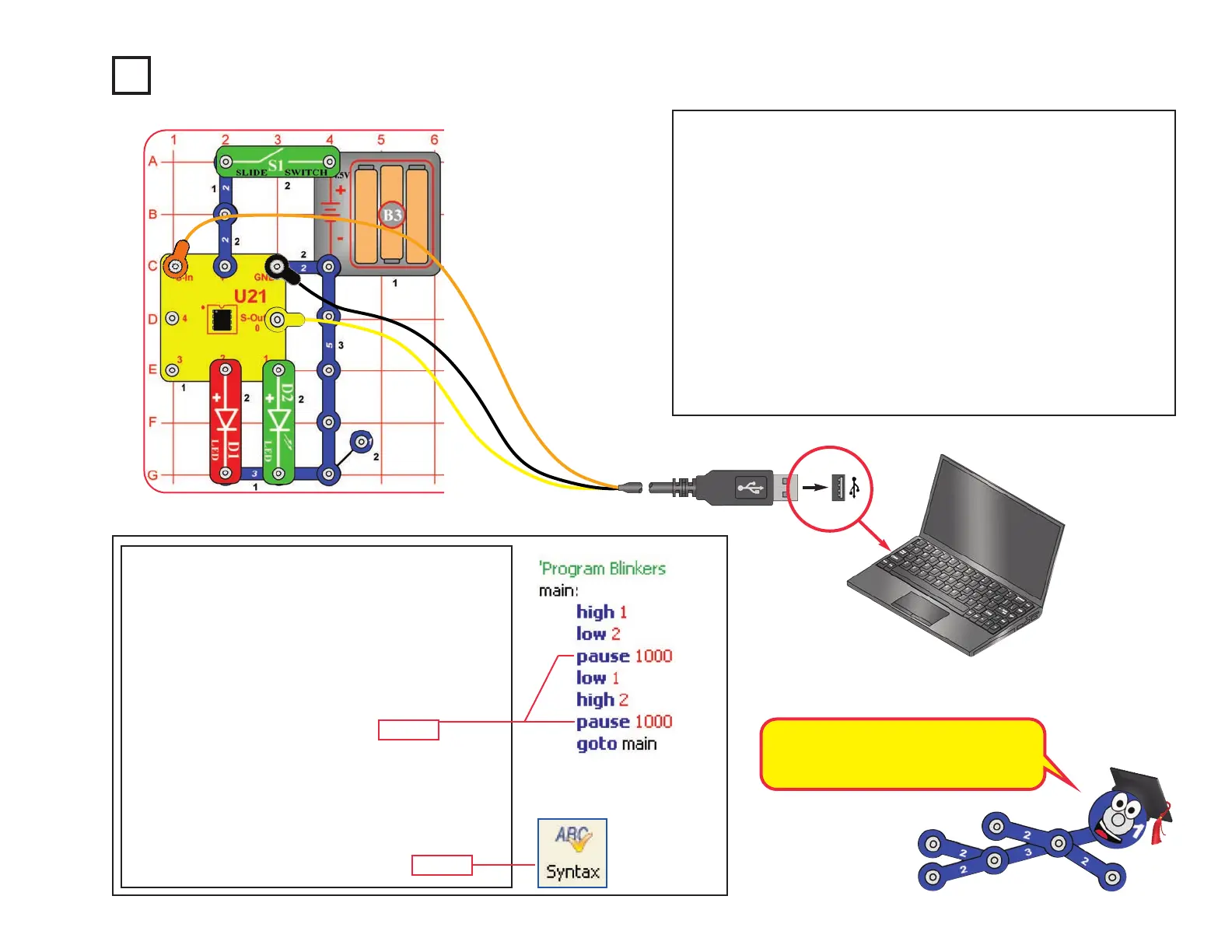 Build this circuit and turn on the switch (S1). Load program