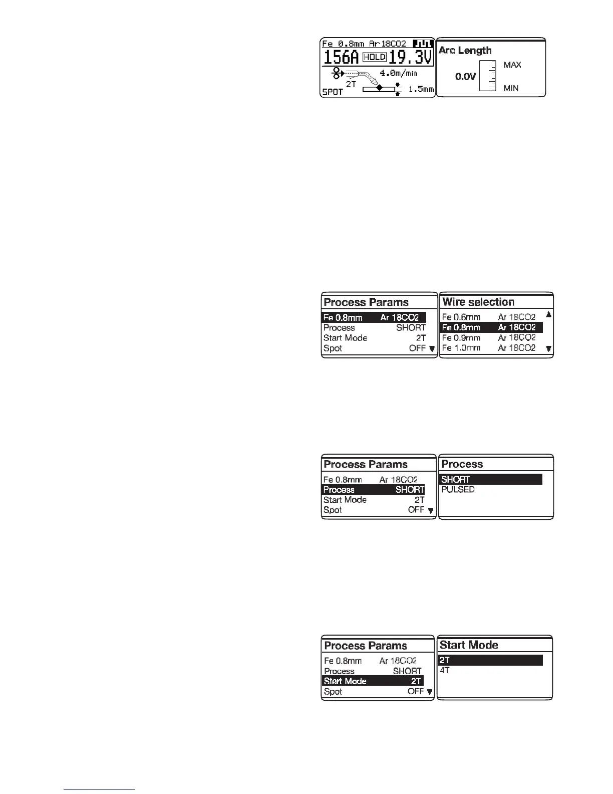synergic curve used, the welding mode 2T or 4T, SPOT
