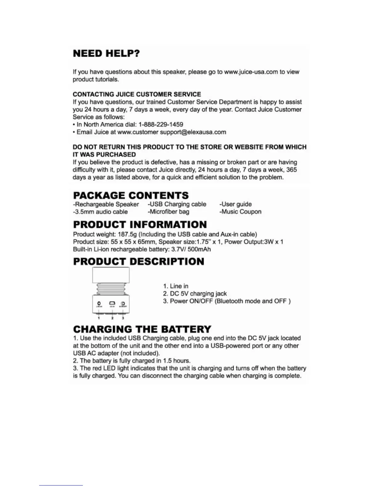 Elexa Juice - Need Help?; Package Contents; Product Information; Product Description