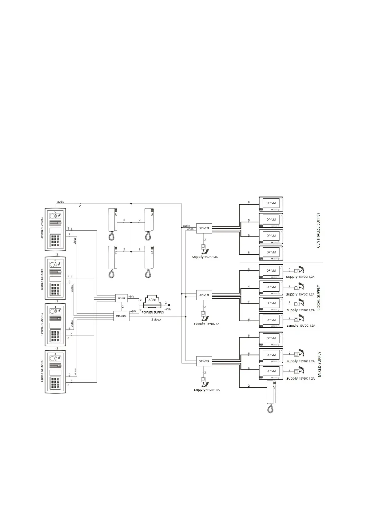 switcher OP-VP4, video signal distributors OP-VR4, video monitors OP-VM. Video lines from each panel
