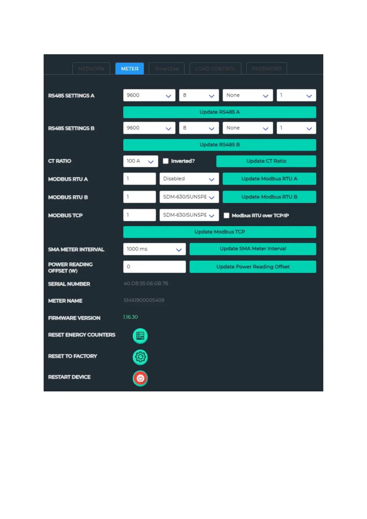 On this page the settings for the Modbus baud rate, protocol and SMA metering settings can be