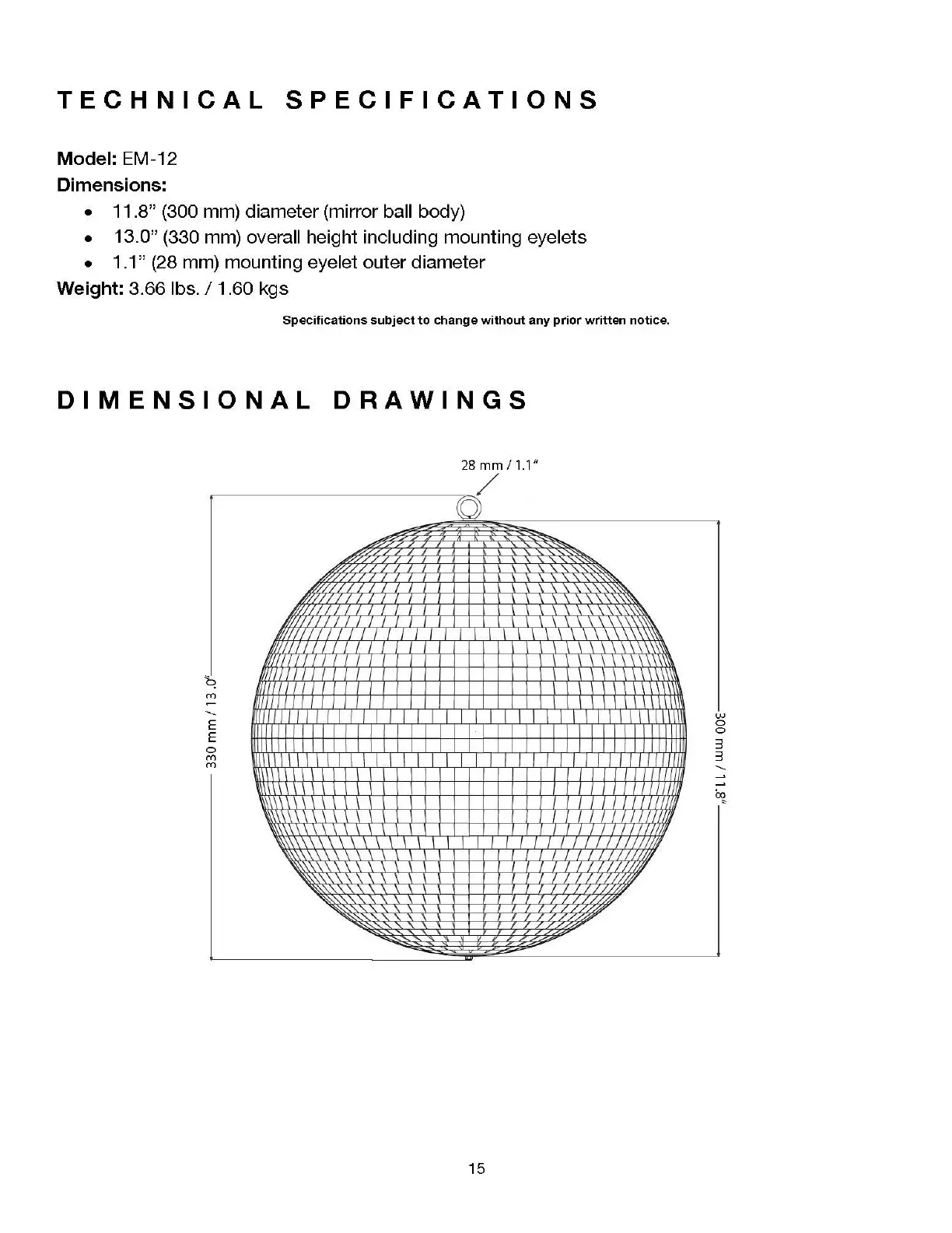 Eliminator Lighting EM12 - Technical Specifications; Model and Dimension Specifications; Weight Specifications; Dimensional Drawings