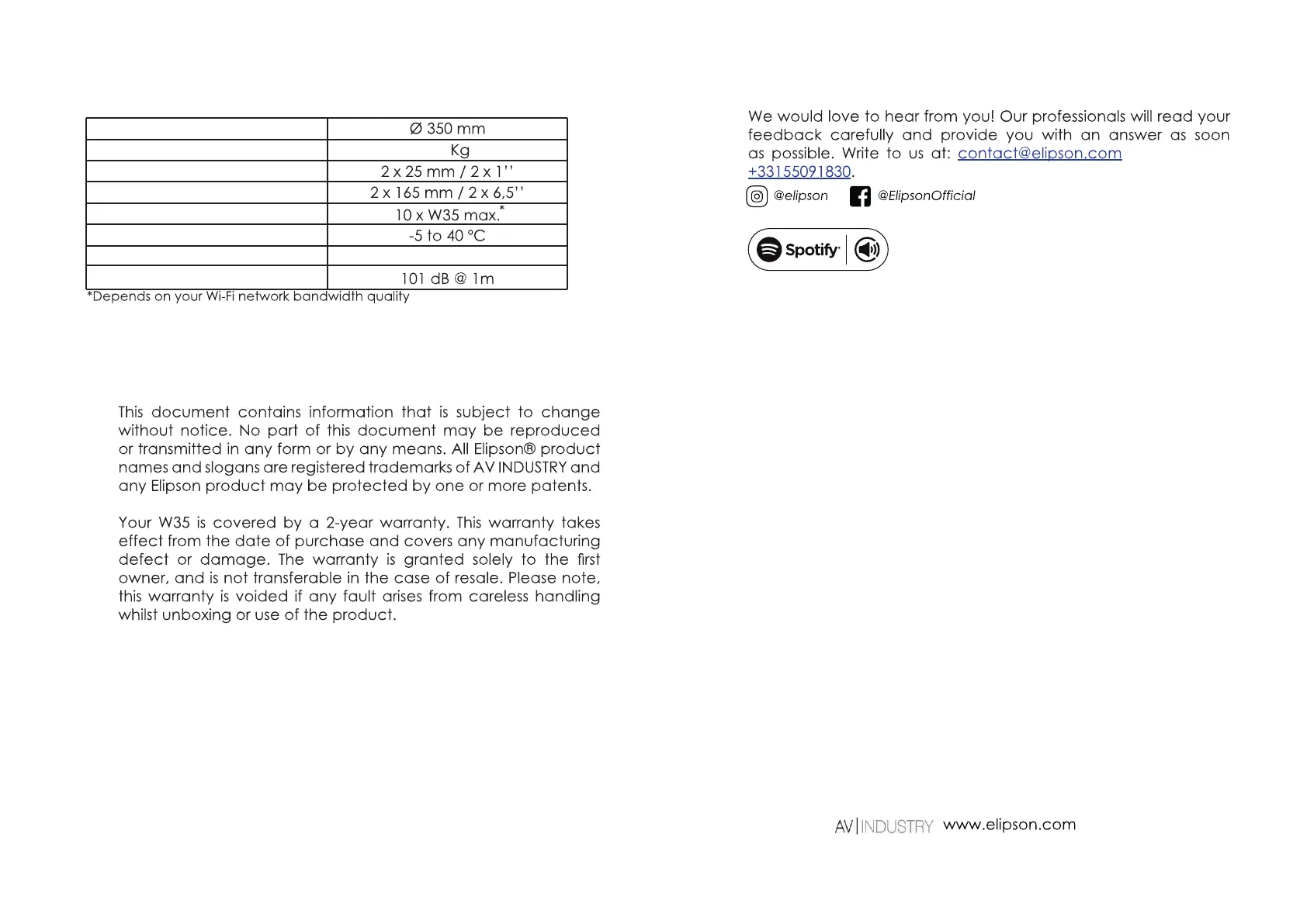 Elipson W35 - Specifications; Contact and Legal Information; Contact & Feedback; Legal Notice