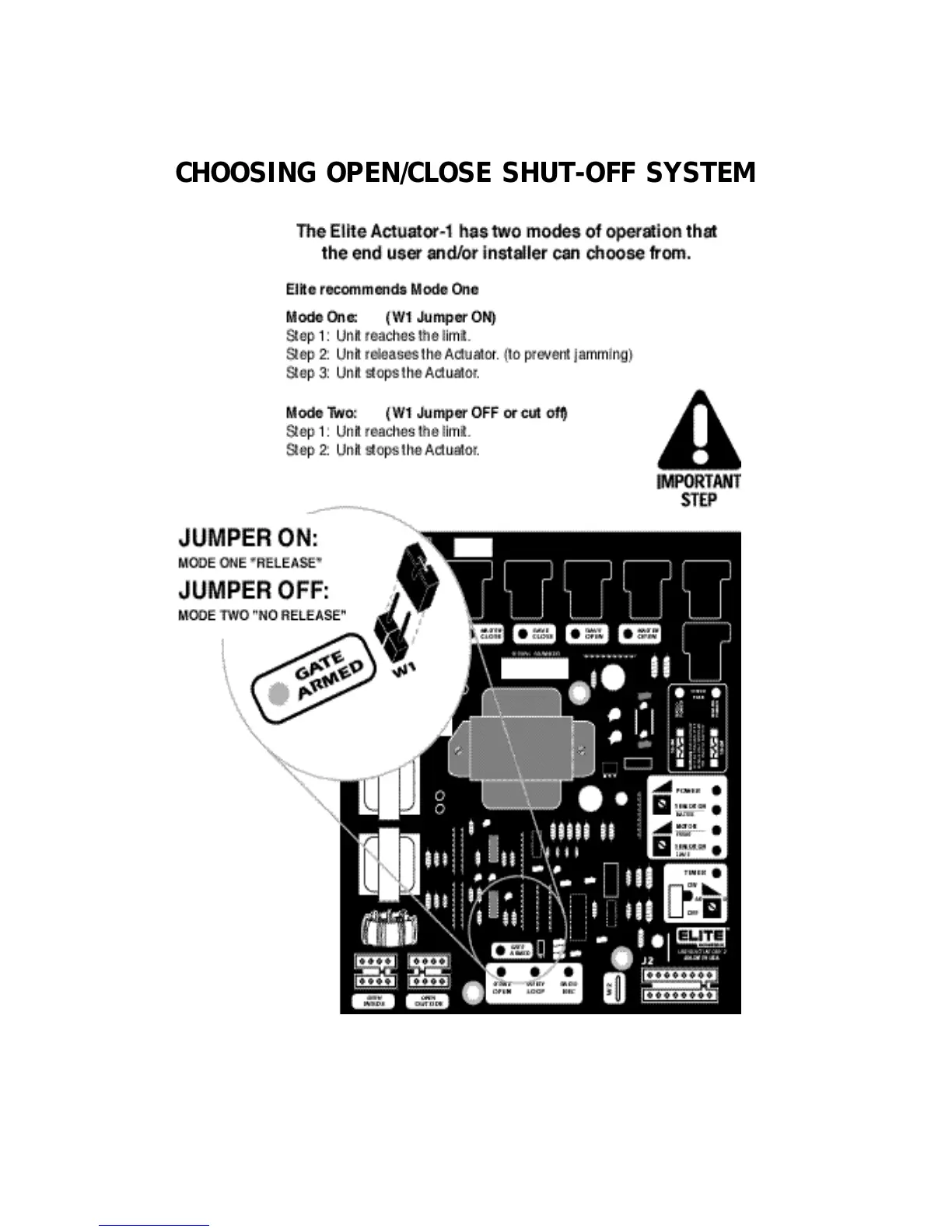 Elite ACTUATOR-1 - Choosing Open;Close Shut-Off System; Mode One: Release on Limit; Mode Two: Stop on Limit