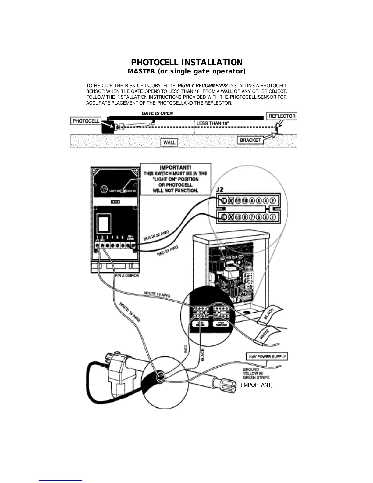TO REDUCE THE RISK OF INJURY, ELITE HIGHLY RECOMMENDS INSTALLING A PHOTOCELL