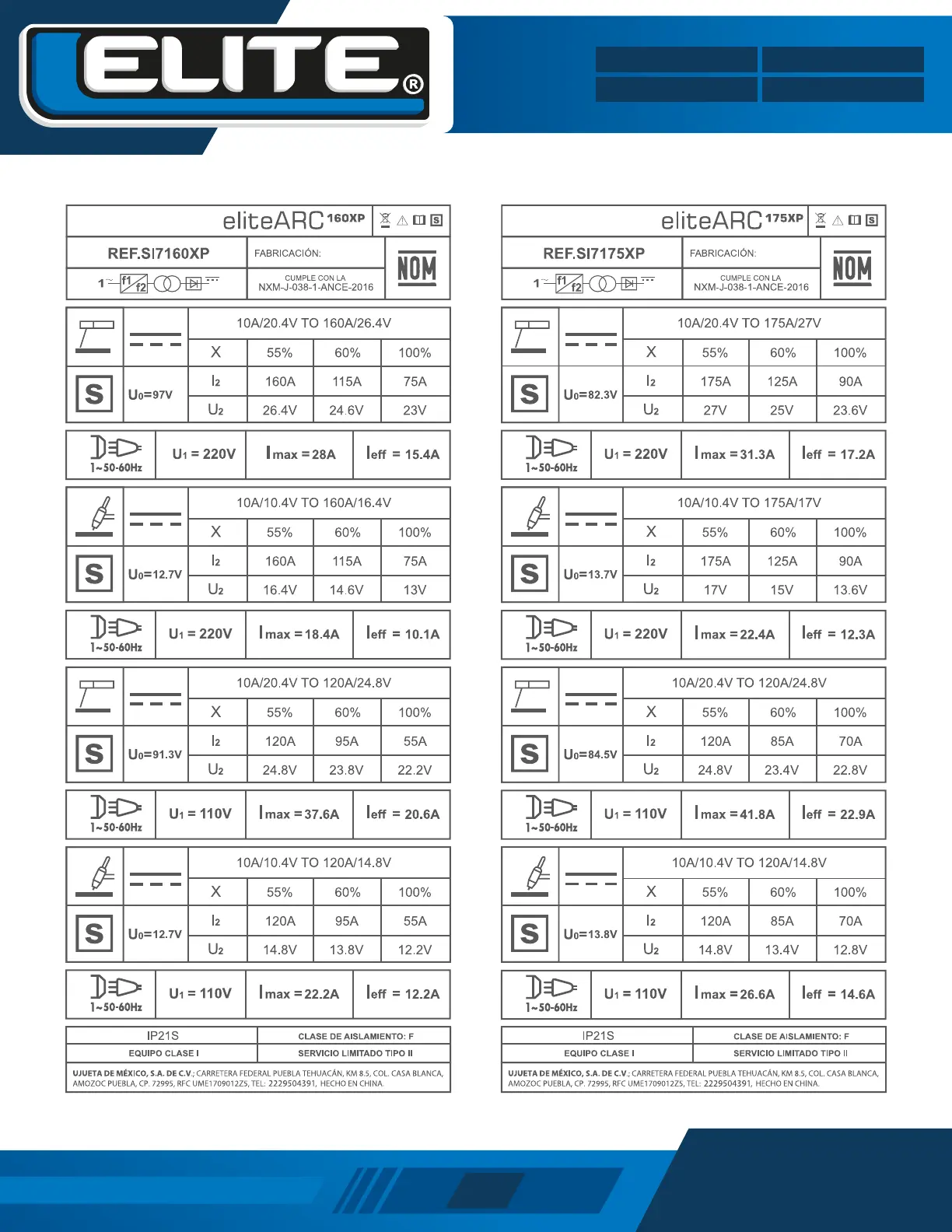 Elite ARC 130XP - Data Plate Specifications (160 XP & 175 XP); elite ARC 160 XP;175 XP Data Plate Details