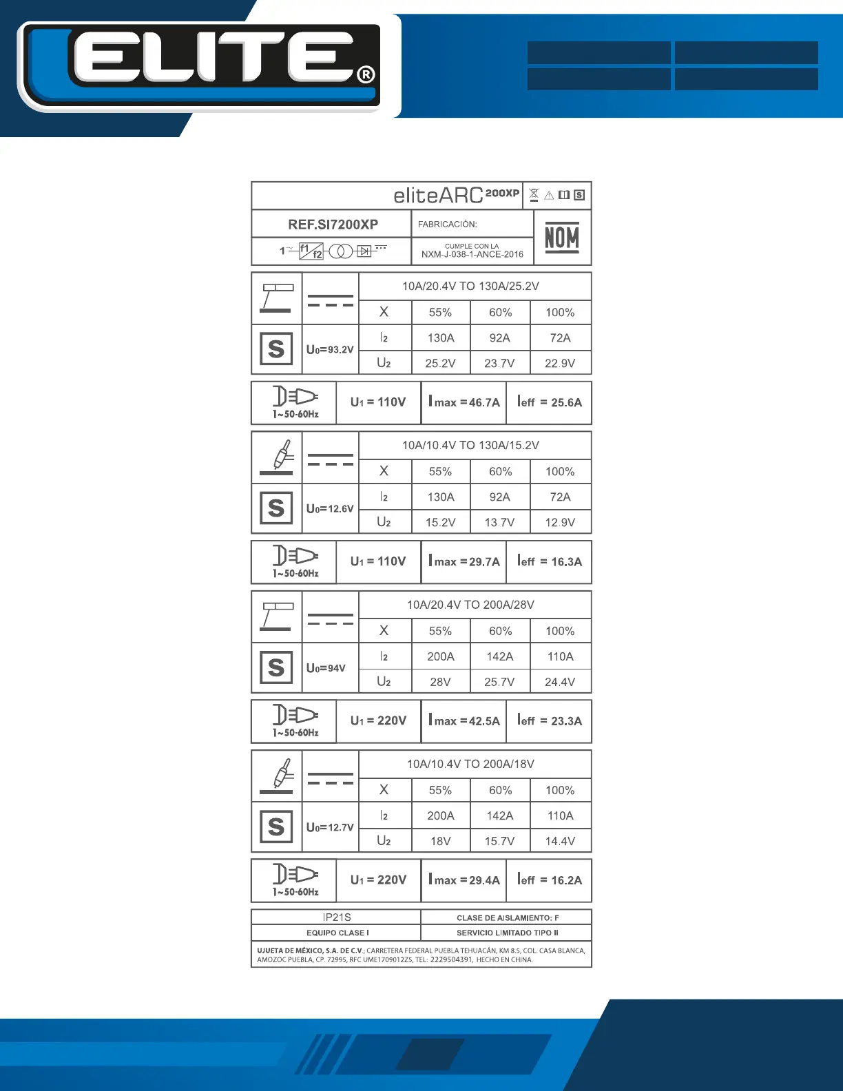 Elite ARC 130XP - Data Plate Specifications (200 XP); elite ARC 200 XP Data Plate Details