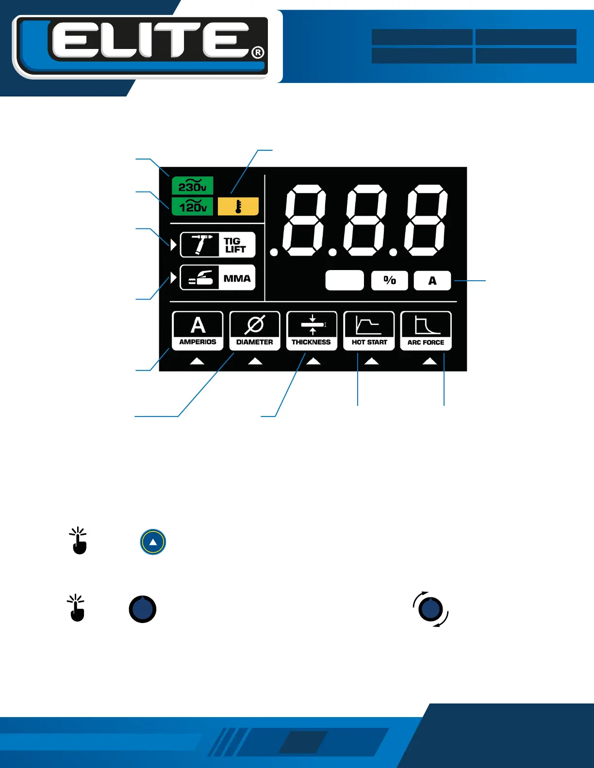 Press the button to switch between the MMA (Small Stick Welding or SMAW) and TIG (Gas Tungsten Inert