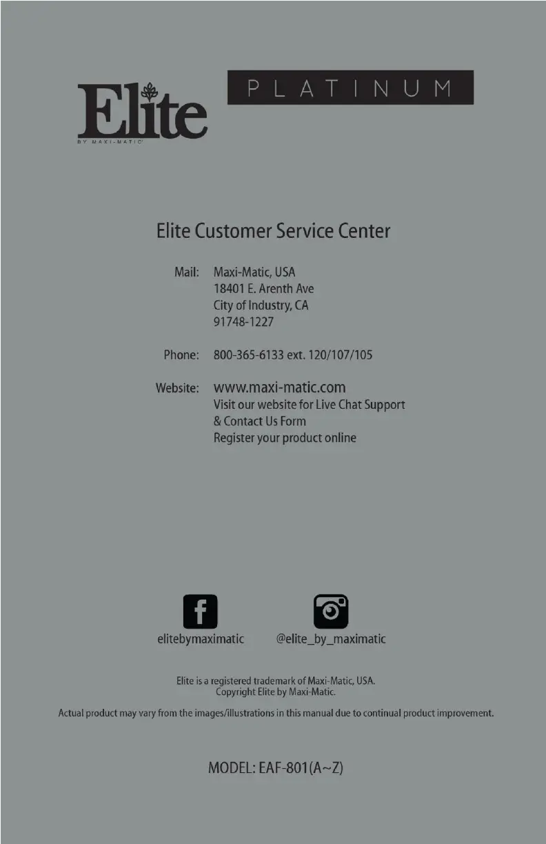 Elite PLATINUM EAF-801A - Elite Customer Service Center