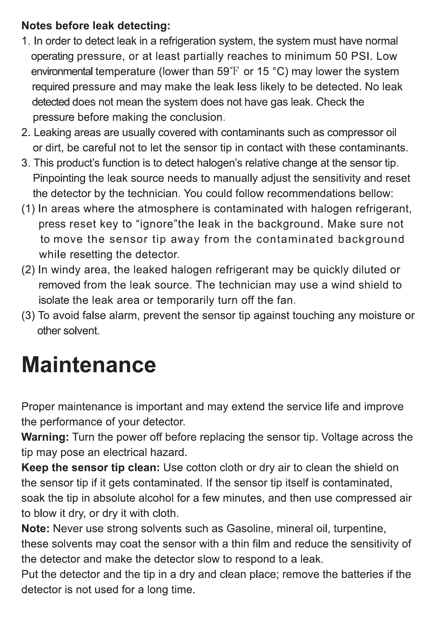 (3) TO avoid false alarm, prevent the sensor tip against touching any moisture or