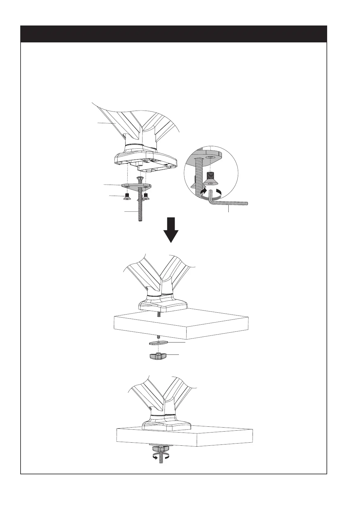1B-2 Run carriage bolt (H) through grommet hole in desktop. Attach metal plate (J) and wingnut (G).