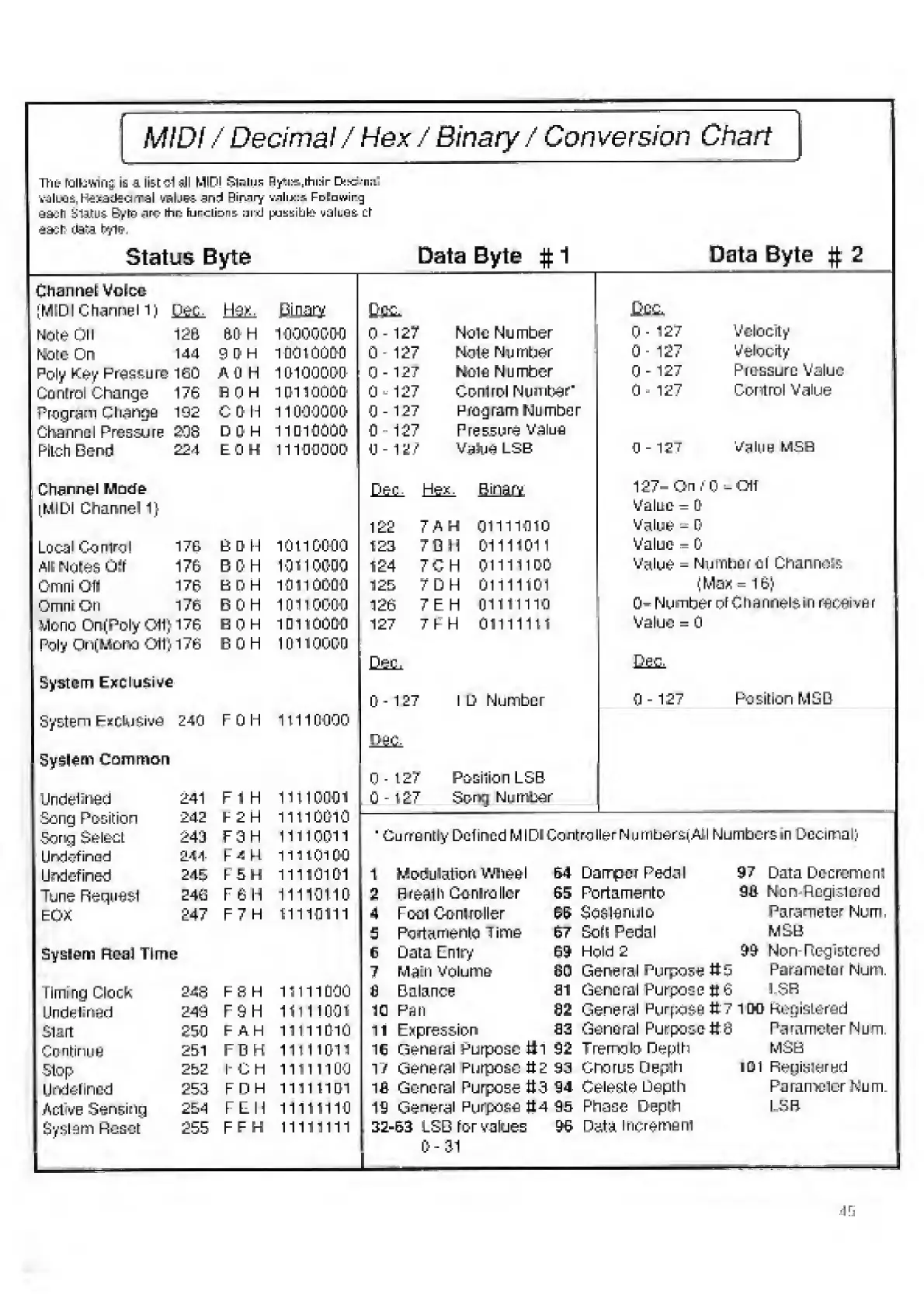 Elka MK55 - MIDI;Decimal;Hex;Binary;Conversion Chart