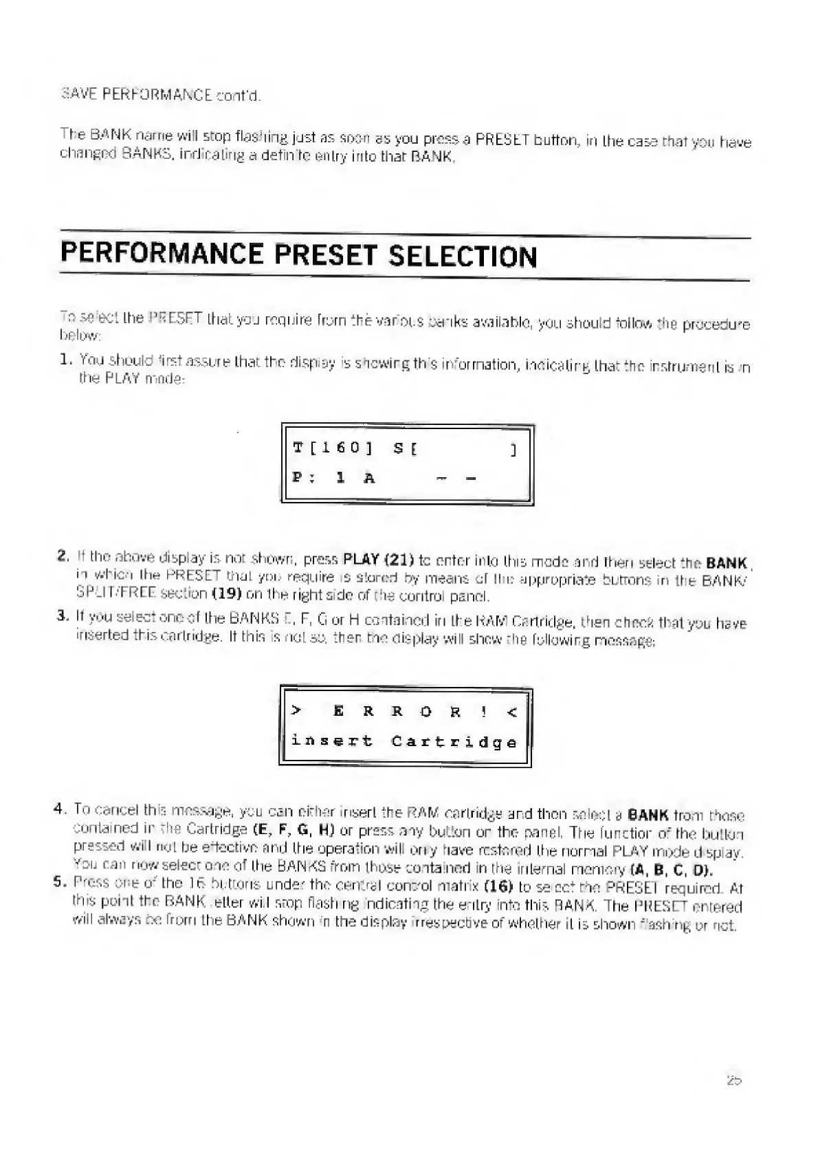 Elka MK88 - SAVE PERFORMANCE contd.; Performance Preset Selection