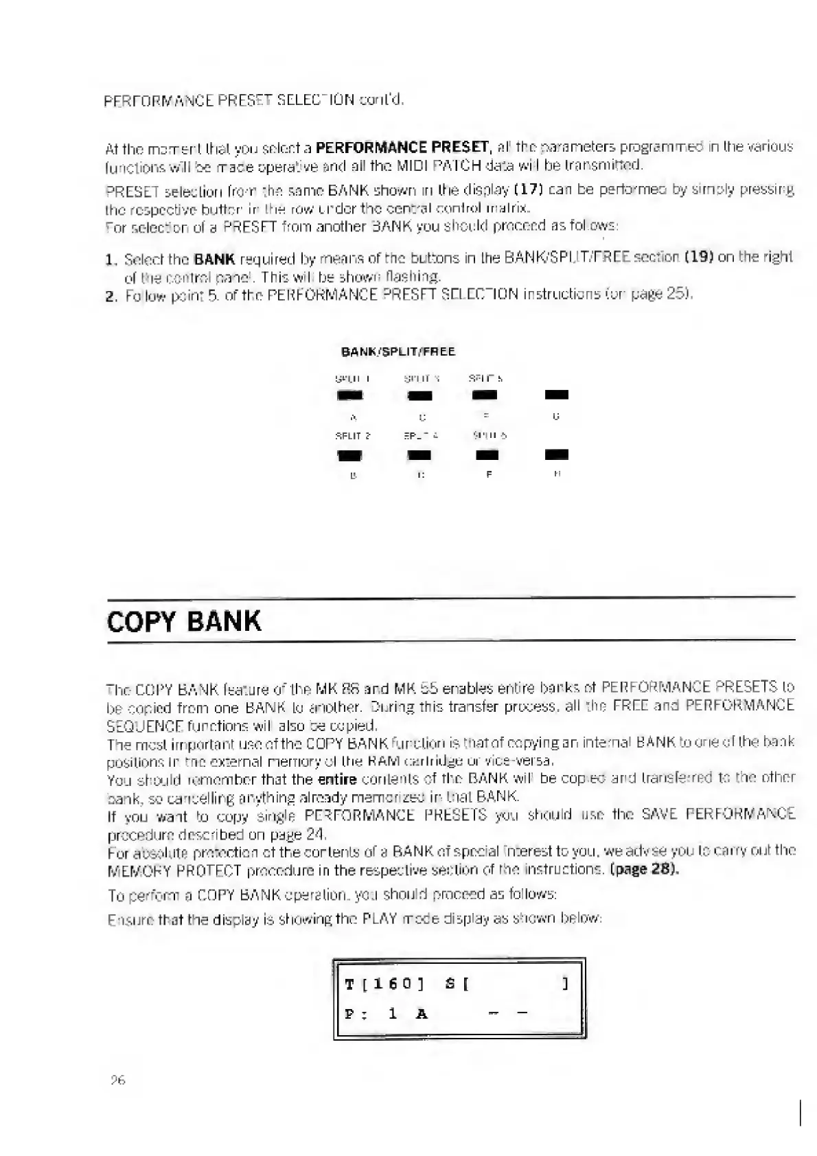 Elka MK88 - PERFORMANCE PRESET SELECTION contd.; Copying Banks