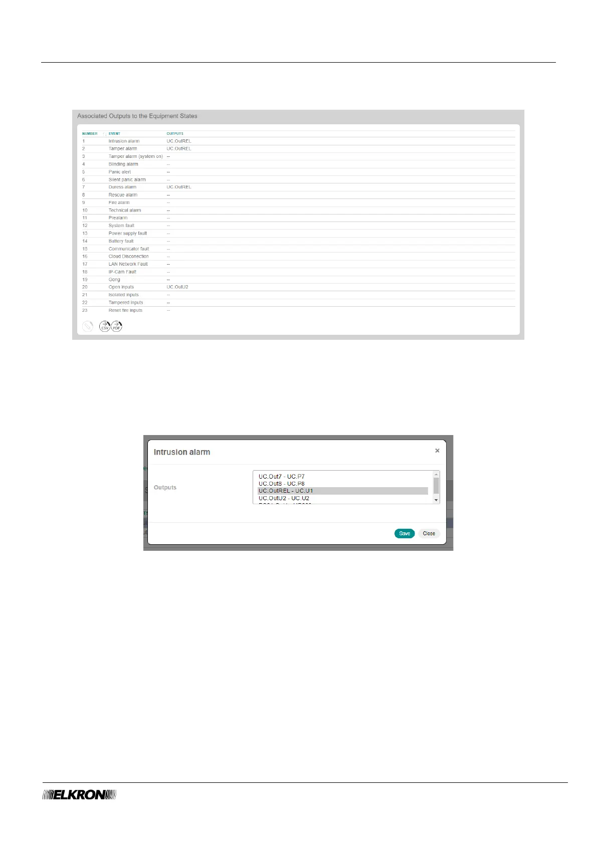 All default events of the panel and, for each event, the output(s) that are activated when the event occurs.