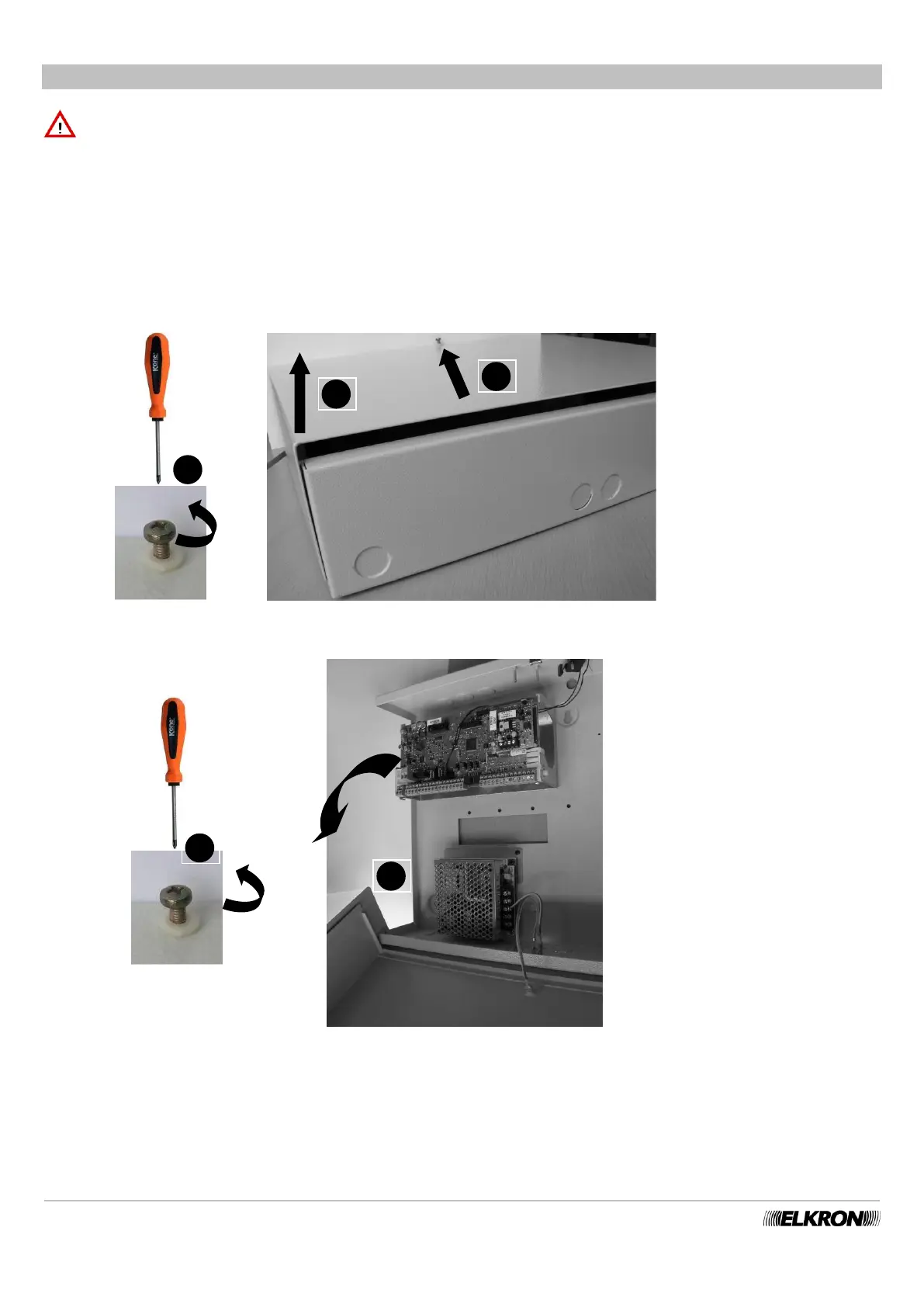 Unscrew the screws on the cover (1) and flip it downward (2)